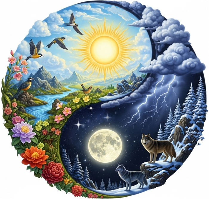 Em nosso planeta, a dualidade continuou sua obra criativa. Dia e noite, calor e frio, luz e sombra proporcionaram as condições necessárias para o surgimento e a evolução da vida. Ciclos aparentemente simples—como o movimento entre claro e escuro, períodos úmidos e secos, frio e calor—regulam o ambiente terrestre, promovendo condições favoráveis para que organismos simples se tornassem progressivamente mais complexos.
